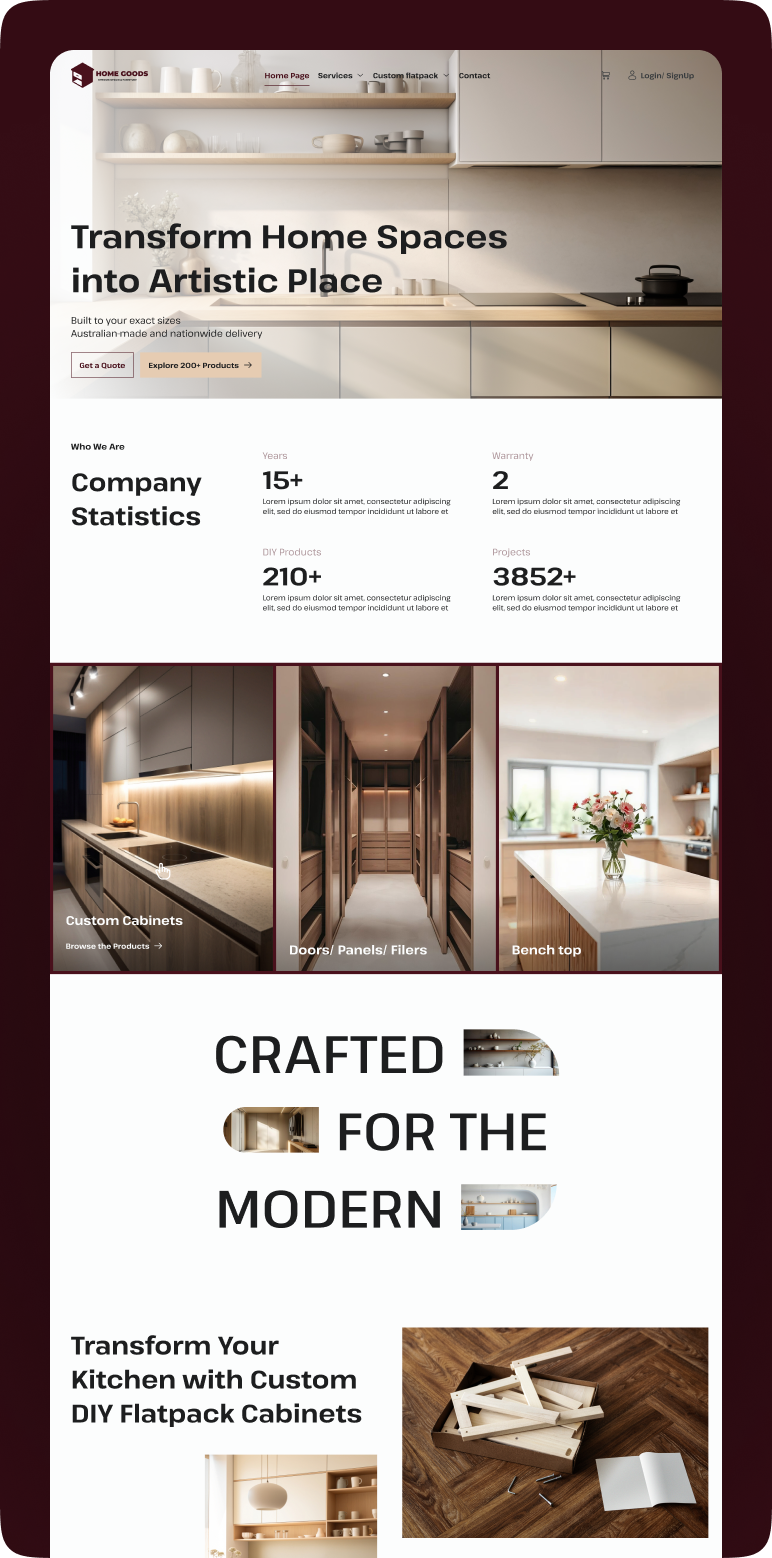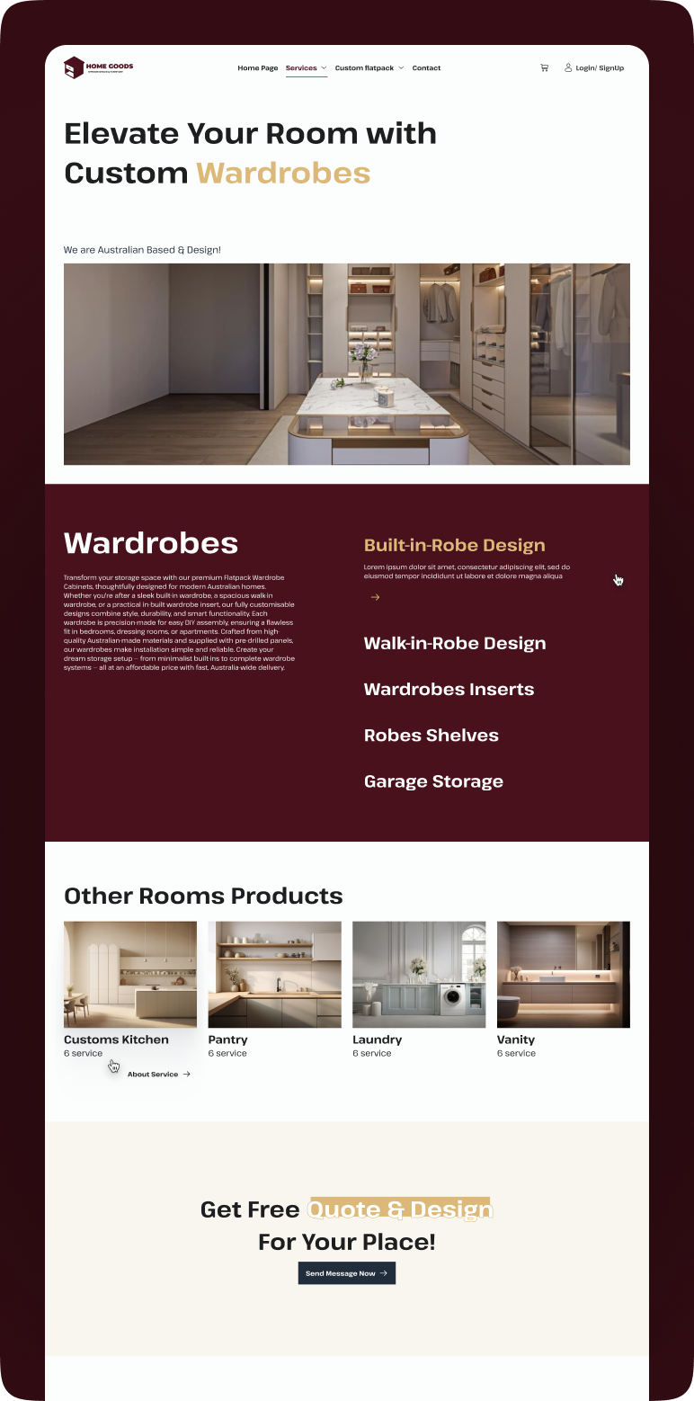 The homepage is designed to give users a clear and welcoming introduction to the brand’s custom cabinetry and home-storage solutions. A clean layout highlights key product categories and showcases craftsmanship through high-quality visuals. Strategic call-to-actions guide users toward exploring services, browsing collections, and requesting quotes. The structure focuses on clarity, trust, and smooth navigation, ensuring users can quickly find what they need. Overall, the homepage creates a warm and modern first impression that reflects the brand’s identity.